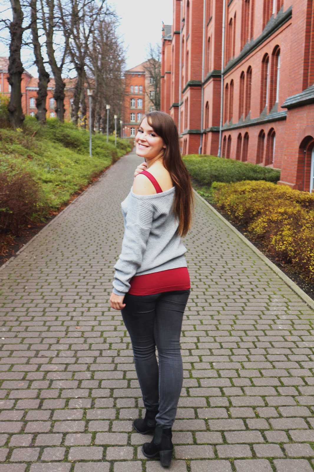 Diese ist nämlich dieser super kuschlige Off-Shoulder Pulli. Der Strick ist wunderschön warm und das Schulterfreie gibt ihm einen sexy Twist. Ich kombiniere dazu gerne entweder ein Top in einer auffälligen Farbe (so wie in diesem Fall ein älteres langes Oberteil von H&M) oder ein feines Spitzentop. Ich kann ihn mir aber auch sehr gut in Kombination mit einem Kleid und Strumpfhose für die kältere Jahreszeit vorstellen. Ich liebe einfach den etwas weiteren und bequemen Schnitt, vielleicht werdet ihr ihn also in nächster Zeit hier oder auf Instagram noch des Öfteren zu sehen bekommen. Es gibt ihn derzeit immernoch bei Missguided. Selbst wenn er zwischenzeitlich ausverkauft sein sollte, wird er im Moment immernoch immer mal wieder ausgestockt.